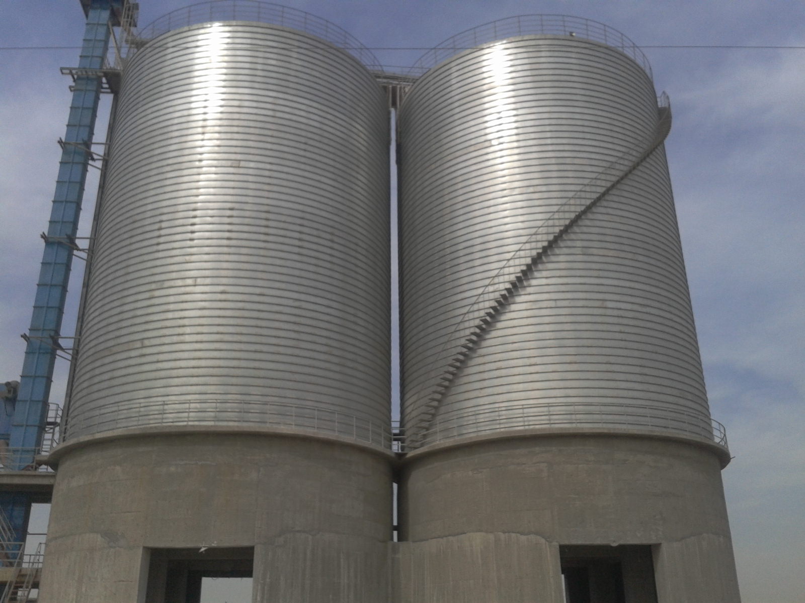 1;钢板仓在建造过程中,完全由专用设备施工,螺旋咬合钢板仓专用设备由承载机架、开卷机、弯折机和成型机组成,在卷制过程中,将495 mm宽的卷板送入成型机扎制成所需的几何形状,再通过折弯机弯折、咬口、仓体外壁咬制成一条五倍于材料厚度 30mm-40mm宽的螺旋凸条,大大加强了仓体的承载能力,使钢板仓的整体强度、稳定性、抗震性优于其它池罐。另外,利蒲仓采用的材料是防腐性能特别强的镀锌钢板,利浦钢板仓的仓体直径在5---20m以内选择,高度可在30m以下选用,这使得它的寿命也比其它池罐长。